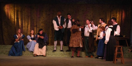Duke Senior (Peter Esposito), Jaques (Lee Peters), Orlando (Bradford Stevens), Amiens (Steve Figg) with the exiles in the Forest of Arden.