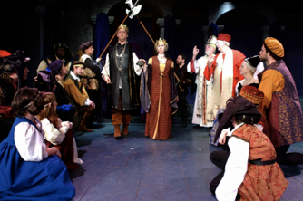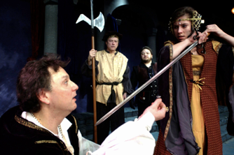 Queen Margaret (Ellen Peace, dethroned) curses Richard Gloucester (David Skvarla).
